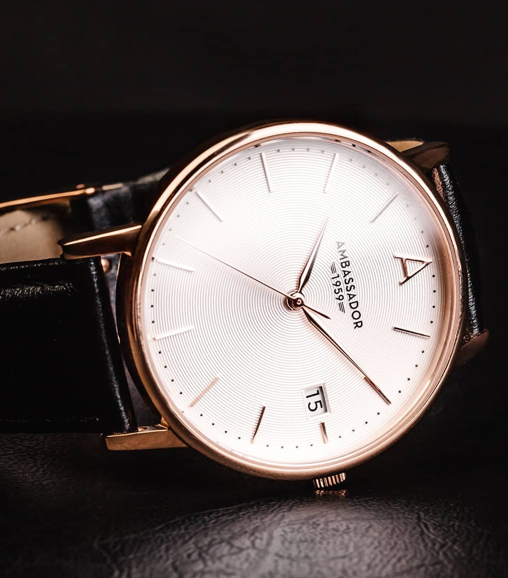 We have always been impressed by watches from the middle of the 20th century. The Heritage 1959 was designed to be a true tribute to the spirit of the "Golden Age" that takes after its tones of expansionism and financial prosperity. To make this refined vintage look even more exceptional, we shortened the lugs on our design, included a sleek date-window on a gorgeous unique dial, and topped off the number markings with the trademark Ambassador 'A'.