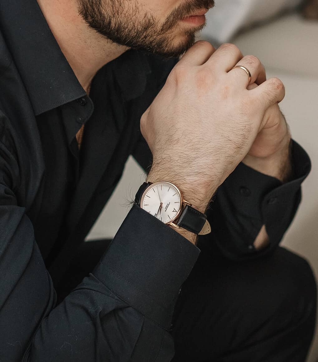 This watch is nine-millimeter-thick steel, forty millimeters in diameter, with a 316-L polished case that is coated in rose-gold. The dial on this timepiece is extremely unique, as it is a concentric circular pattern that is covered by sturdy sapphire glass. Keeping time with a Miyota quartz movement, the face of this wristwatch embodies our brand with a signature ‘A’ at the top to complete the look.