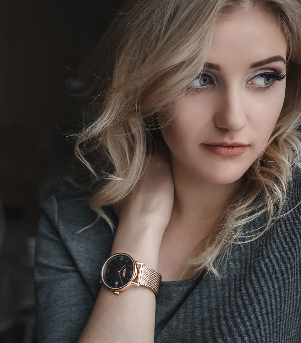 This watch is nine-millimeter-thick-steel, forty-millimeters in diameter, with a 316-L polished case that is coated in rose gold. Vastly different in appearance compared to our other pieces, this watch comes with a Sunray dial, gold baton hands, Roman numerals, and a posh engraving on the back of the case. Gold and black are a theme of this timepiece, making it unlike anything else in our collection.